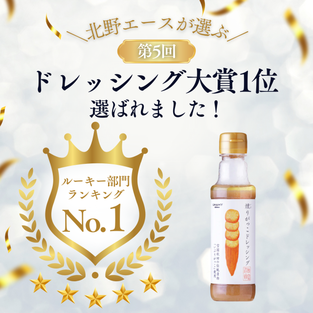 この度、弊社UMAMY燻りがっこドレッシングが北野エーススタッフが選ぶ第5回ドレッシング大賞「スター発掘部門1位」に選ばれました。